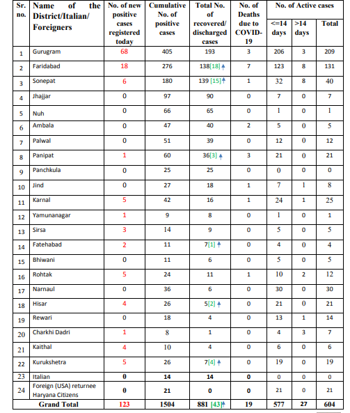 Haryana saw biggest ever spike in a day when 123 new C19 cases registered today. The total cases in the state climbed over 1500. With 18 new cases Faridabad remained at number two position after Gurugram where 68 new cases registered today.